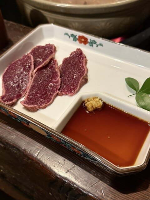 はじめにいただいたのが鹿のタタキ。食中毒は注意しないといけませんがクセなく美味しいです。続いて猪の焼肉。ジビエらしい香りと歯応えがお酒によく合います。