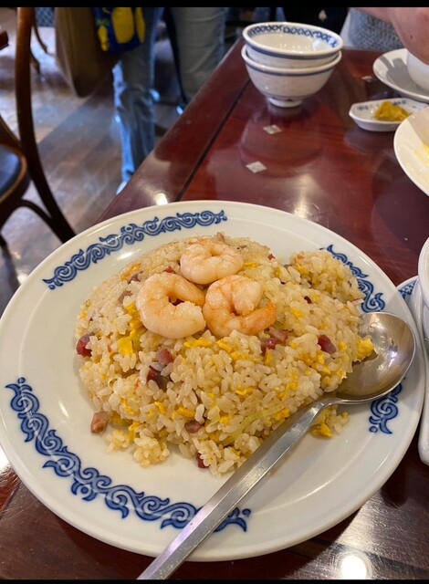 炒飯、大きな海老3匹また良い香り、パラパラだけど油が多かった。