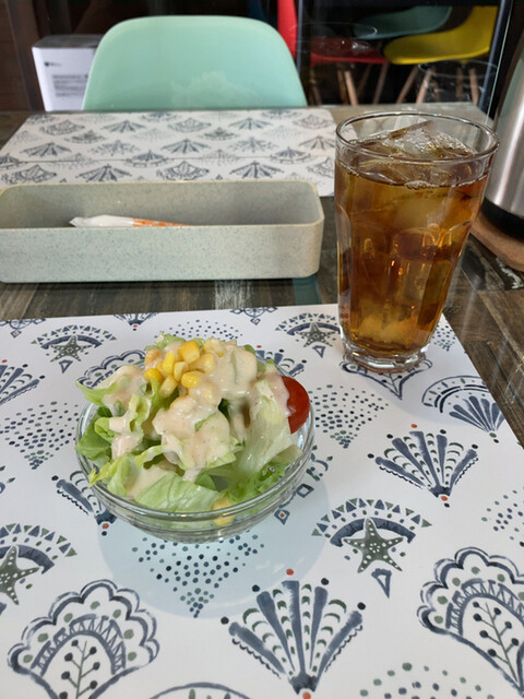 サラダ。レタスがメイン。ミニトマトとコーンが乗っている。ドレッシングも旨い。