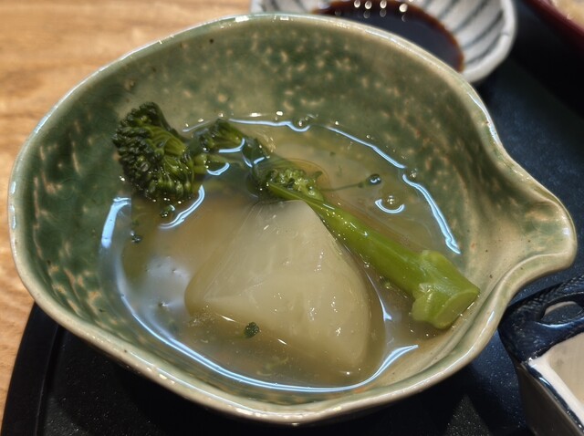 この和定食激ウマ!先ず持って和出汁が秀逸。メインの魚フライはサワラらしいけどとても柔らかくフワフワ食感で優しい系のタルタルソースがベストマッチングアプリ。旬の食材のタケノコは自分の大好物って事もあり嬉しい悲鳴。それと今日のご飯は新潟産新之助らしいんだけど米質もさる事ながら土鍋で必要量だけ炊いた炊き立てでこれまた美味し。珍しくお代わりしちゃった位。この内容と品質で税込1000円ポッキリ。食後のお茶も美味しかったし夜もいいけどランチもオススメっす!