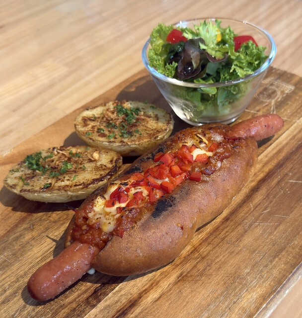 ランチプレート。ホットドッグとベイクドポテトとサラダのセット。ホットドッグはケイジャンドッグでソーセージは黒豚プレミアムソーセージチョイス。パンはパリパリに焼かれててソーセージが粗挽きで肉色しい。ケイジャンソースは最強の5辛にしたけど確かにそこそこの辛さがある。サラダはフレッシュでベイクドポテトが何気に美味いしホットドッグの良きお供になりがち。