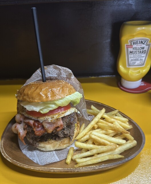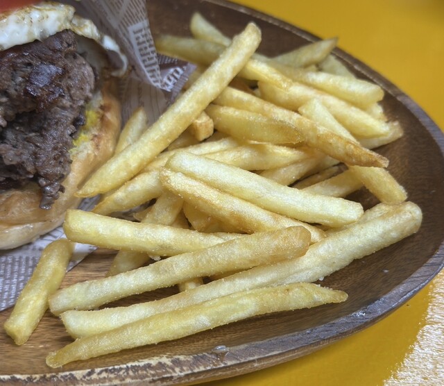 ダブルバーガー。エッグトッピングした事もあってかなりの分厚さ。このままでは到底口に入り切らんので押し潰すとパティから肉汁が溢れ出した。これはもう間違いなく美味いヤツ発覚。そのパティは軽めの加減で捏ねられてるのかいい意味でポロポロっとした食感で肉々しさ満点劇場型。バンズも表面がパリパリに焼かれてて美味いしレタスも高鮮度でシャキシャキ。このままでも何の問題もないんだけど卓上にケチャップとマスタードが設置してあったんで適宜かけてみると味変効果でこれまた面白い。ポテトもカリカリ系で自分の好きなマクドナルド型。