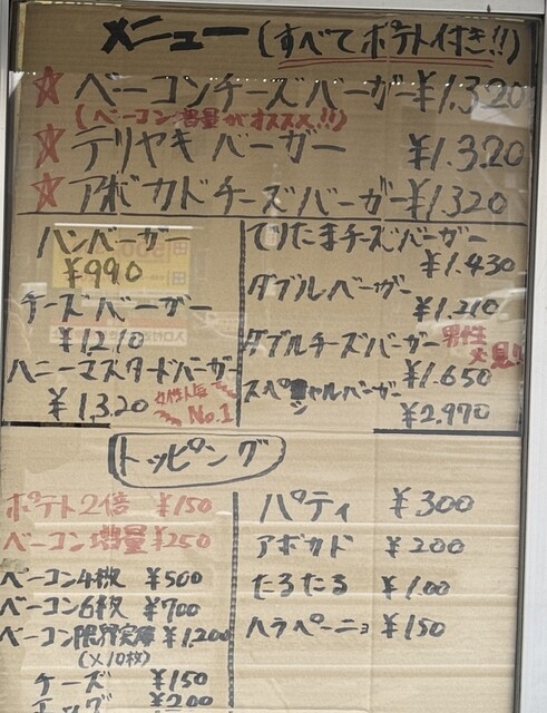 北九州では食べた事のないタイプのパティだなと経緯を問うと元は沖縄でやっててその後にカナダ(小倉の金田ではない)のトロントでもハンバーガー屋さんをやってたとか。その後に帰国してキッチンカーでやったりとかで今に至る的な。まだお若いのに色々と経てたまに経られて北九州ナウ。面白いね。因みにドレッドヘアだけどレゲエは聴かないしドラッグもアルコールのみらしいよ。ともかくハンバーグは美味いし店のお兄さんも愉快で感じがいいよ。オススメっす!駐車場は店の真ん前にコインパーキングあるよ。