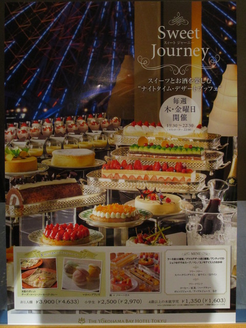 毎週、金・土曜日の19:30~22:30までの間、ナイトタイム・デザートブッフェ『スィートジャーニー』を開催しており、時間無制限で3,900円(税・サービス料込4,633円)、小学生2,500円(税・サービス料込2,970円)、4歳以上の未就学児1,350円(税・サービス料込1,603円)。
