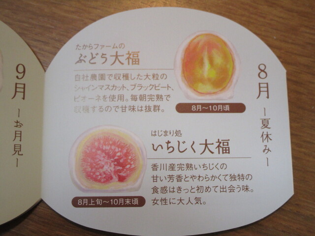 シャインマスカット、ピオーネ、柿といった秋季のフルーツ、栗を使った大福があり、夏季のマスクメロン大福も残っていたので、ラインナップとしては悪くない内容。