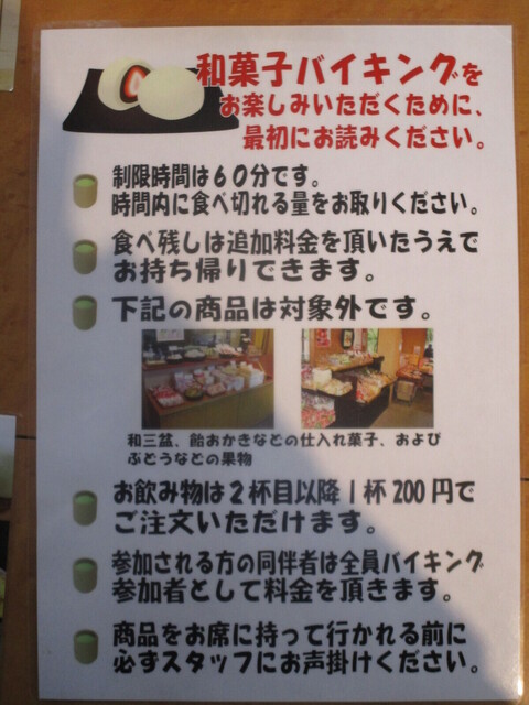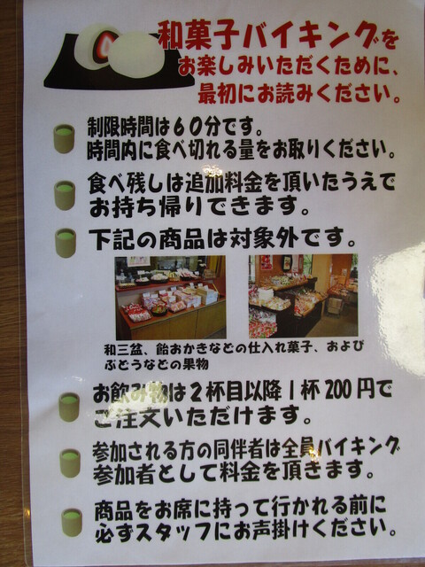 毎月2回、10:00~11:00、11:10~12:10、12:20~13:20、13:30~14:30、14:40~15:40までの間、和菓子バイキングを開催しており、60分制で2,000円(税込)、3歳以下無料。