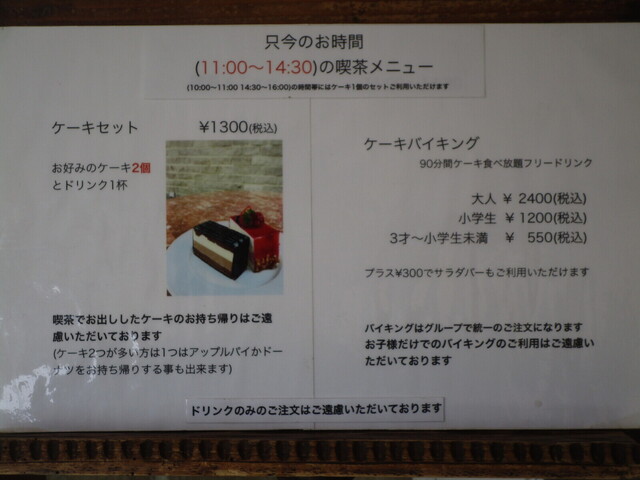 毎日、11:00~14:30(気候や天候により早く閉店する場合あり)までの間、ケーキバイキングを開催しており、90分制で大人2,400円(税込)、小学生1,200円(税込)、3歳~小学生未満550円(税込)。