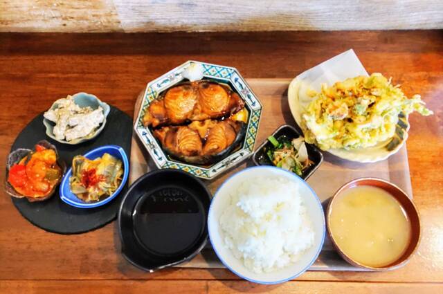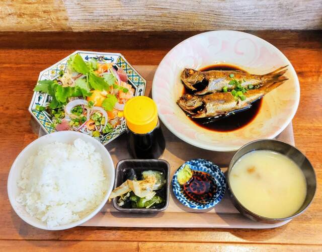 小ムツの煮付け・海鮮ユッケ・小鉢・ご飯・味噌汁の組み合わせ。