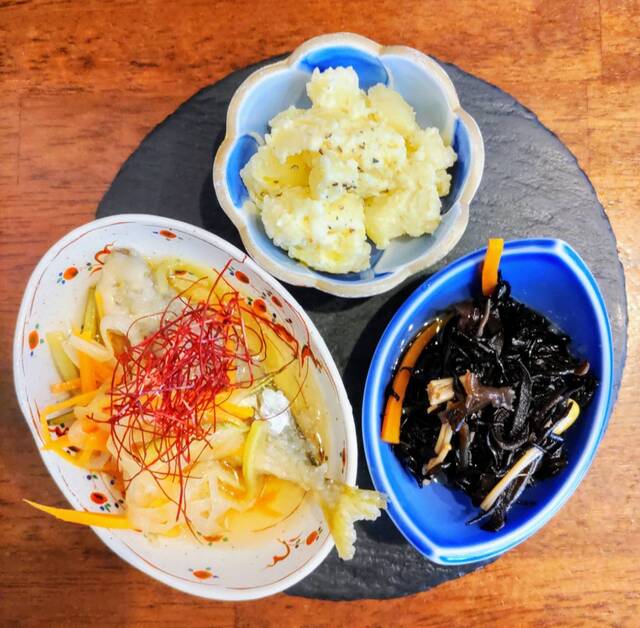 ● おまかせ3種盛り合わせ:ひじきの煮物・アジの南蛮漬け・ポテトサラダの組み合わせ。