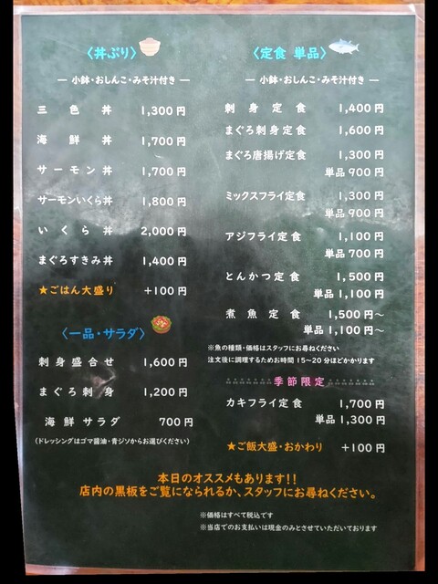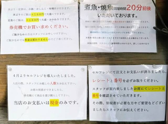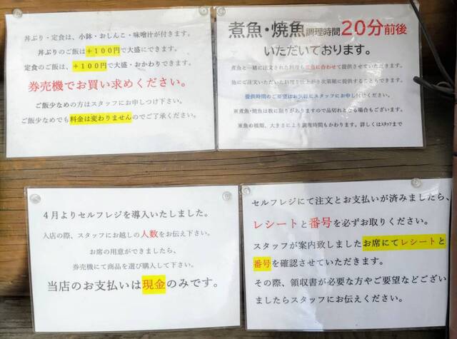 様々なご案内(現金のみ・煮魚や焼魚の提供時間など)