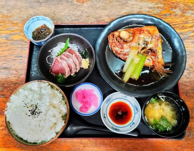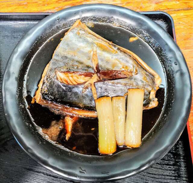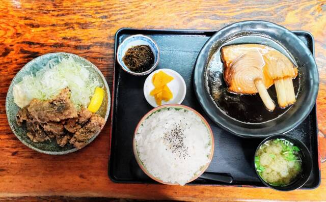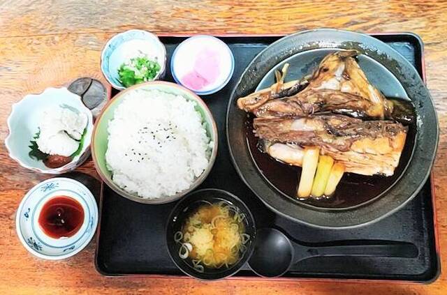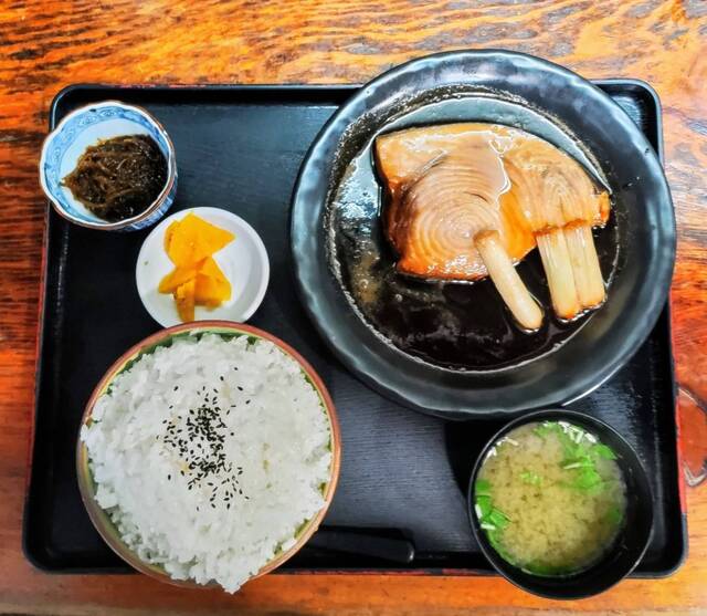 ● ぶりかま煮付け定食:ぶりカマの煮付け・小鉢・漬物・ご飯・味噌汁の組み合わせ。