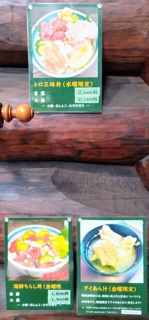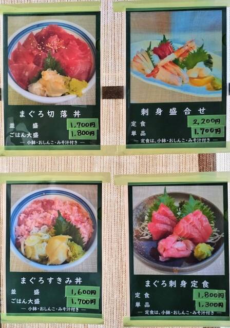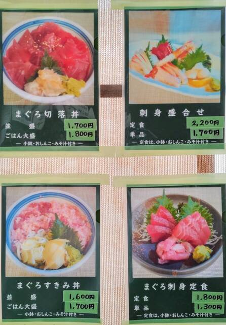 ● 中トロ刺身定食:中トロ刺身・小鉢・漬物・ご飯・味噌汁の組み合わせ。