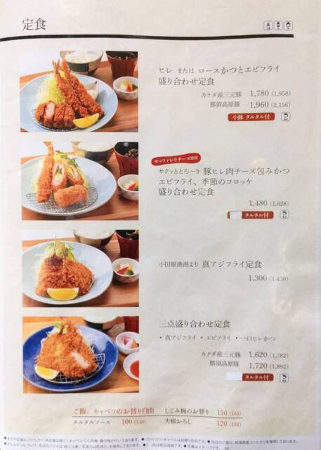 ● 鱧かつと真アジフライと一口ヒレカツ御前:鱧かつ・真アジフライ・一口ヒレカツ・キャベツ・タルタルソ-ス(小)・漬物・ご飯・味噌汁の組み合わせ。