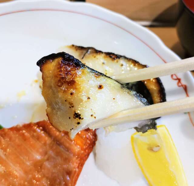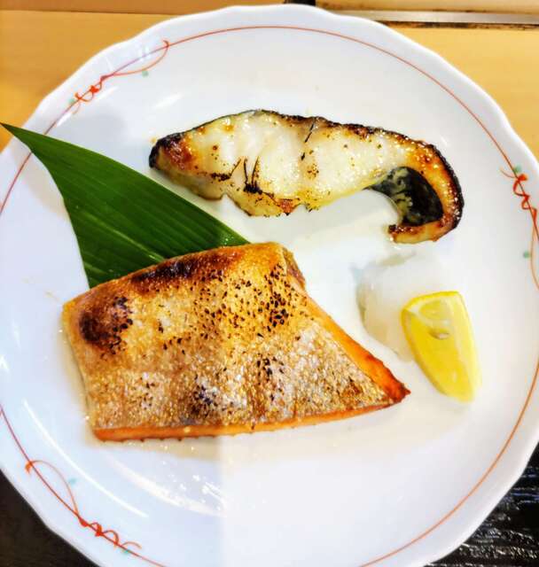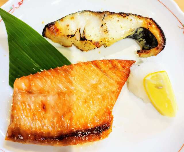 銀ダラの西京焼きとサ-モンのハラス焼きの盛り合わせ定食