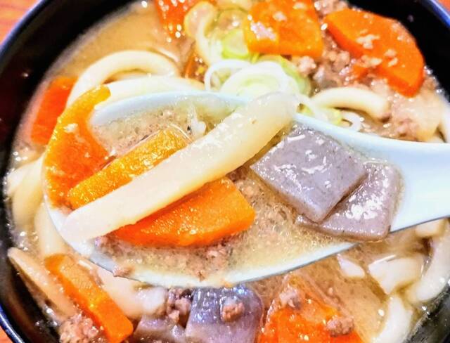 ● 豚汁うどん:「豚ひき肉・大根・人参・ゴボウ・コンニャク・ネギ」などの、具沢山の豚汁うどんです。