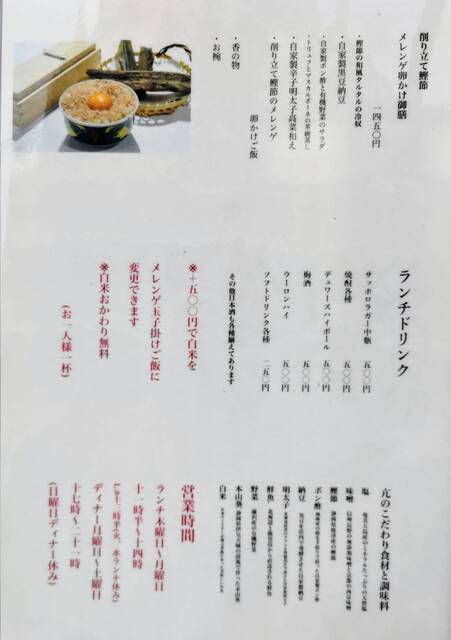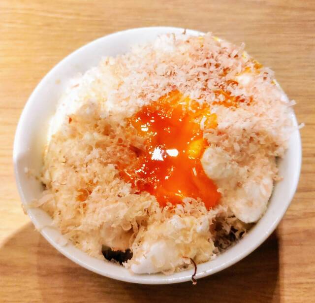 ● 削り立て鰹節のメレンゲ卵かけご飯:フワッフワのメレンゲに味付け生卵が乗ってる、出汁醤油の卵かけご飯と言う感じで、とても美味しかったです。