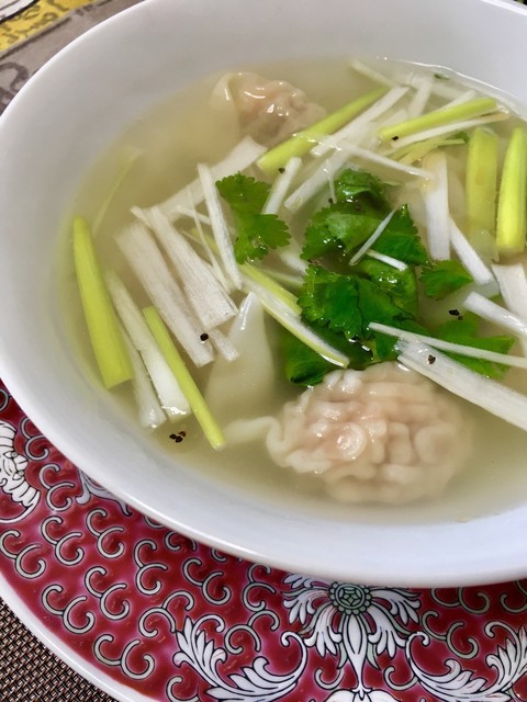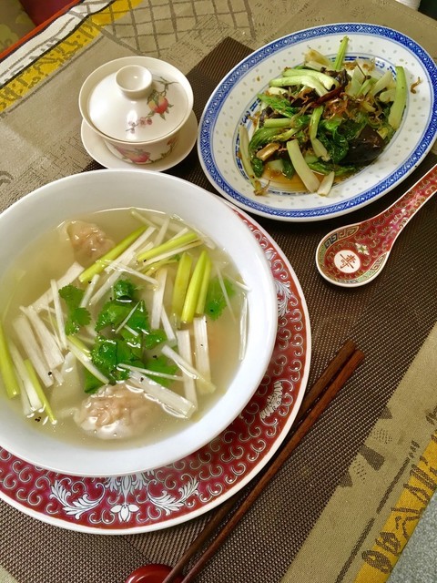 海老雲呑スープと青菜炒め