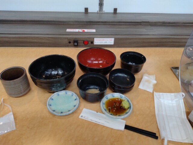 中はファミレス?回転寿司?と思われる客席レイアウト。まるで居抜き店舗。カウンターが広く、また二人用となっていることが回転率を上げているみたい。私のようにひとりの客はまず見なかった。