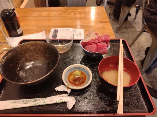 始めはポイポイと口に入れていたので配分を誤ったが、このお店、定食は何杯でもお代わりが自由。そう、このメガマグロ丼も定食なのでご飯のお代わりは何杯でも無料なのだ。しかもマグロブツはこのご飯茶碗3杯分はあろうかというほどの大量なだけに、ボリュームの点からも満足しないはずがない。上手く食べるにはマグロブツを、マグロの煮付けが入っていた小鉢に移して食べた方がすんなり食べられるだろう。ご飯のお代わりもし易いし。