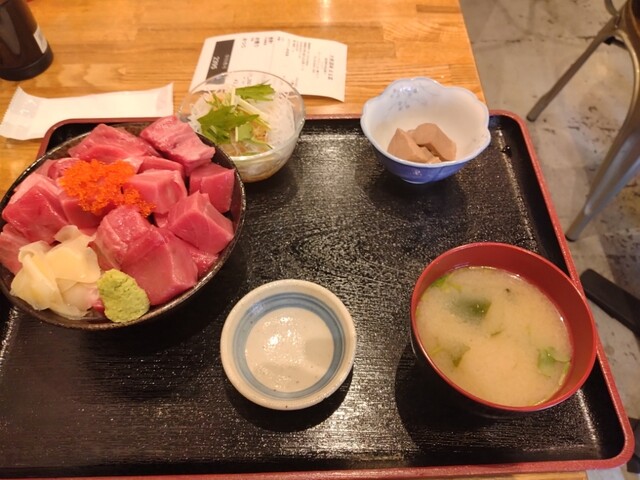 店舗到着は11時20分。まだ誰もいなかったが5分前で私を含めて4人。開店したら8人になっていたくらいの人気店。当然目指すはメガマグロ丼定食1200円。大盛りはない。たった5分で運ばれたソレは、普通のご飯茶碗に乗せられる限界まで乗せたマグロブツが頭に鎮座する。だが、よ〜く見てみると赤身が目立たない程度で、そのほとんどが中トロ。そして赤身と中トロの境目の部分が使われているのが分かる。そう言えば境目の部分なんてあまり見たことがない。また、血合いの部分も少しながら見られた。ということは、これら安価な部位を多用することで、コスト削減を果たしているのではないか?と想像出来る。