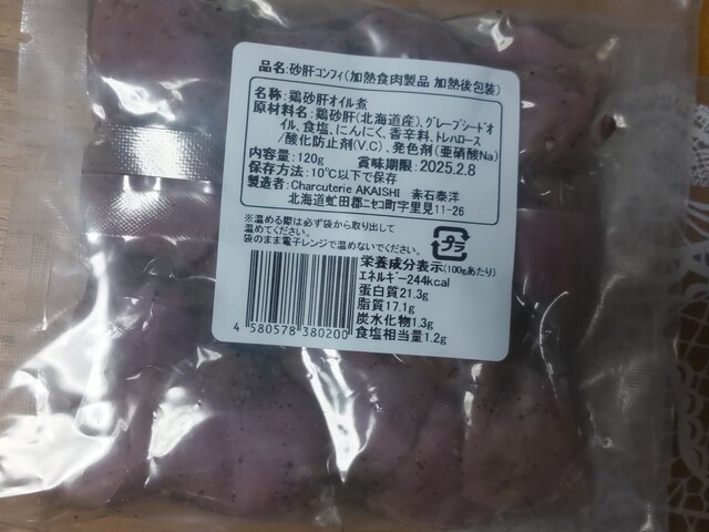 おつまみは鶏砂肝のコンフィとニセコチーズ