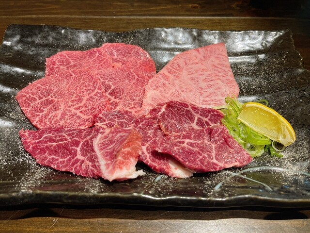 その日の一番美味しい部位を5種類1切れずつ(タン、ハラミ、ヒレ、その他2種等)捌いて持ってきてくれます。