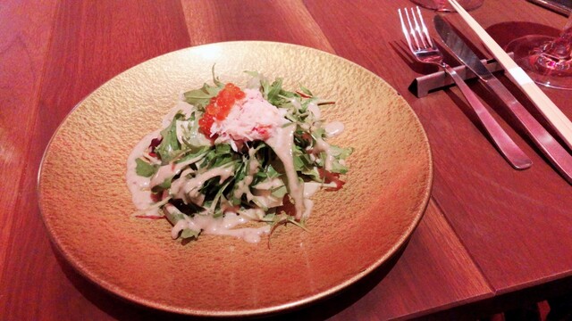 まずはズワイガニサラダの前菜が運ばれる、ナイフ使う?と聞かれ、