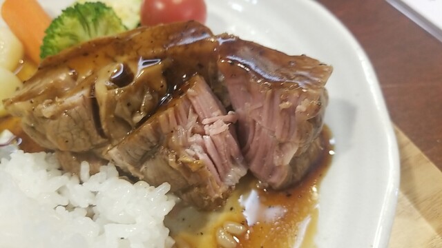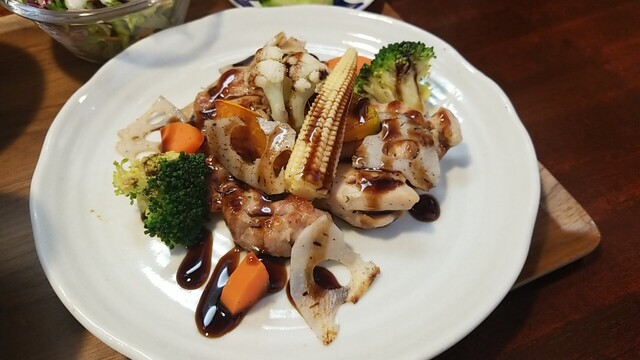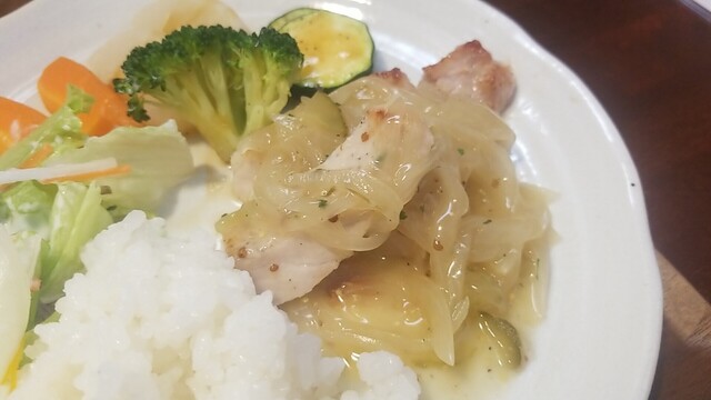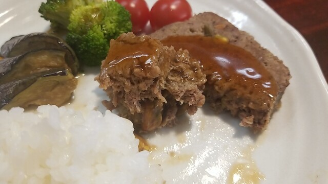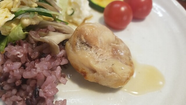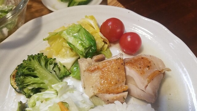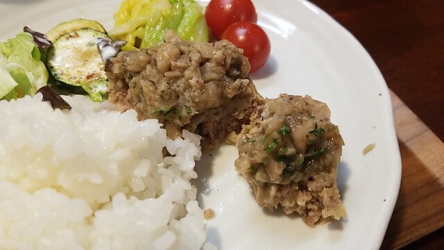 肉汁が溢れ出るので、早々にご飯、サラダを乗せて食べる。