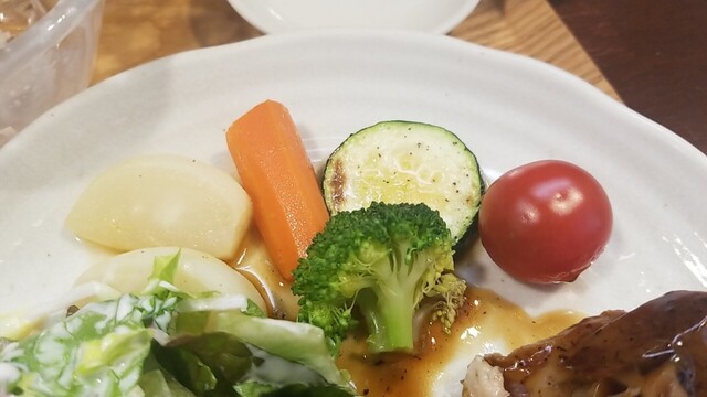 正面から、ポテサラ、ズッキーニ、トマト