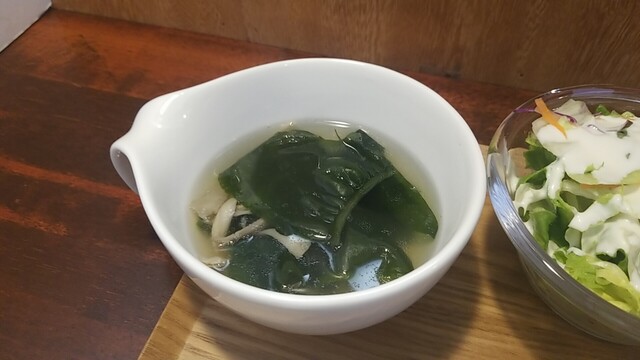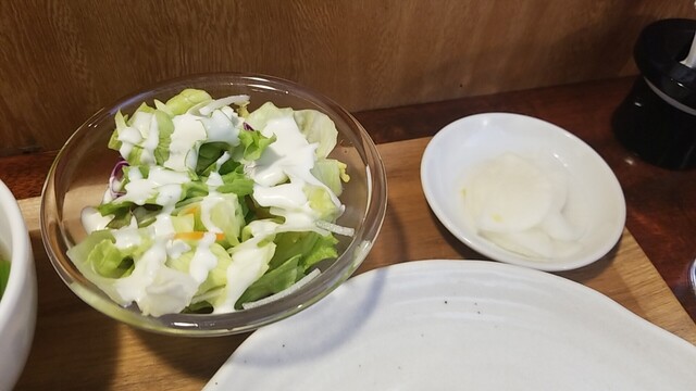 最後はサラダ、お新香、ご飯で口直し、午後も混み始める。