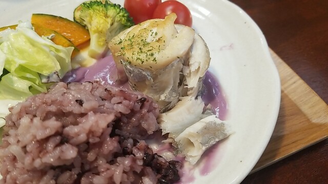 ご飯、サラダ、スープの具材を乗せ、ブリは分厚いので、味が染み込んだ照り焼きが良いかな?