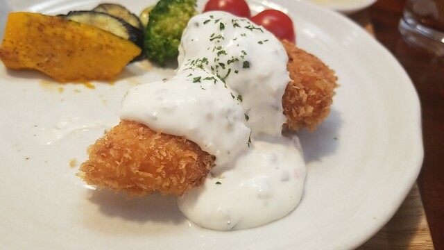 2つ目をカット、マスカルポーネ仕立てタルタルソースは美味いが、気持ちブリがパサつく?