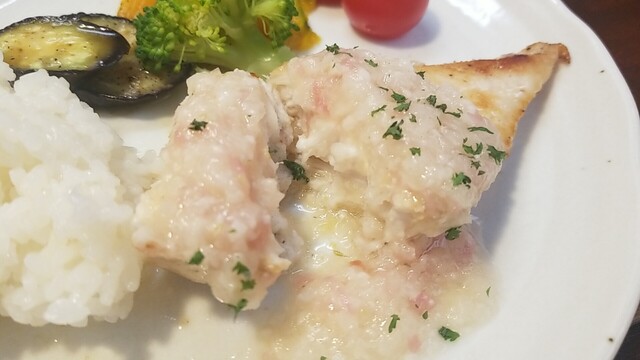 ランチの大盛りとコーヒー、鶏もも肉と海老のバロンティーヌ海老のジュ・ソース。