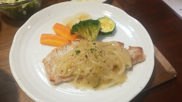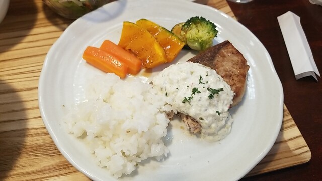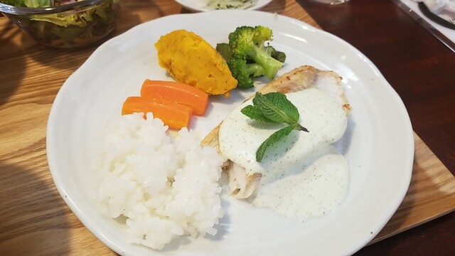 ランチの大盛りとコーヒー、ひめ鯛ポワレ ミント香るクリームチーズのソース。