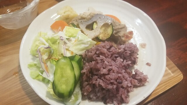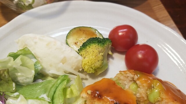 ご飯、サラダ、お新香を乗せてワンプレート