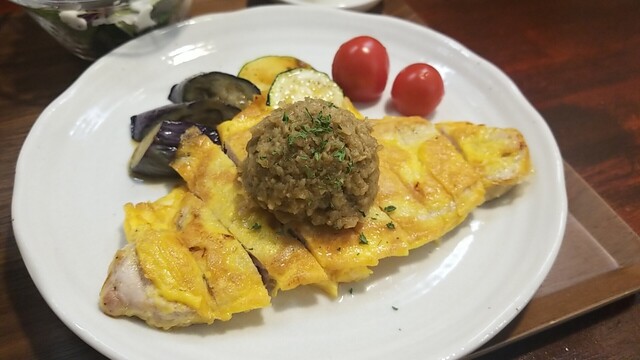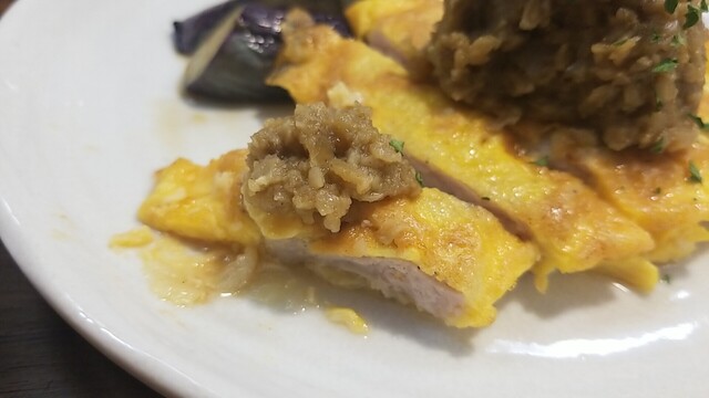 チキンソテー 不思議な味のハリッサと甜麺醤ソースが美味い