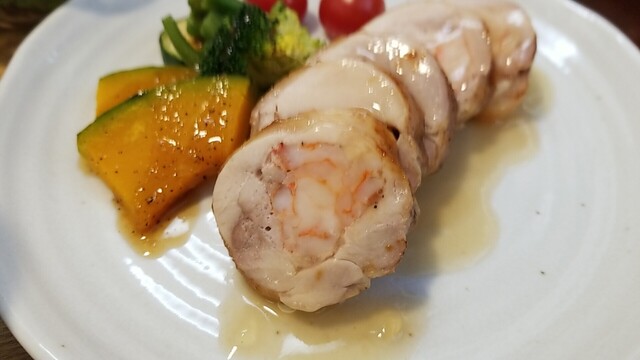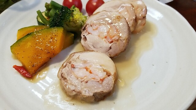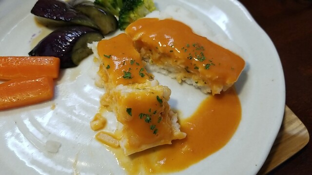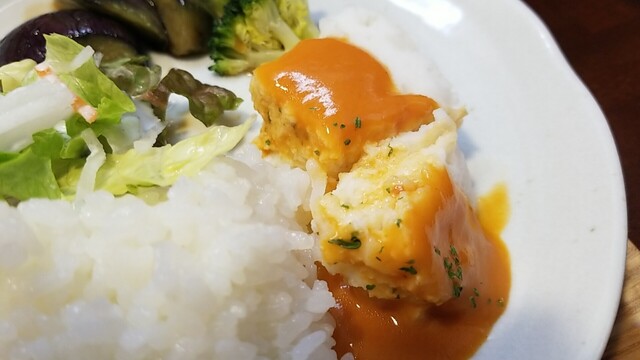海老のつみれと枝豆のハンバーグは気持ち固め、海老のジェ・トマトクリームソースは美味い