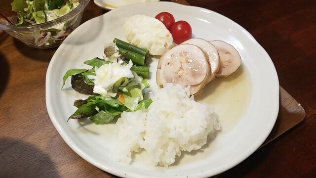 再びご飯、サラダ乗せ、良く見ると上の皮はパリパリ、トマトは甘い。