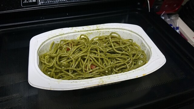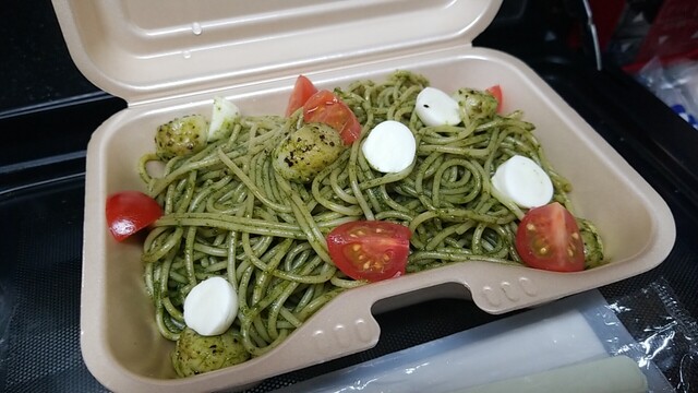帰宅後にチェック、まずは青じそパスタ、クリームチーズ、トマト、ミニ帆立が目立つも、