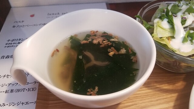 わかめスープはいつも通り、備え付けのズッキーニ、パプリカがソースと絡まる。