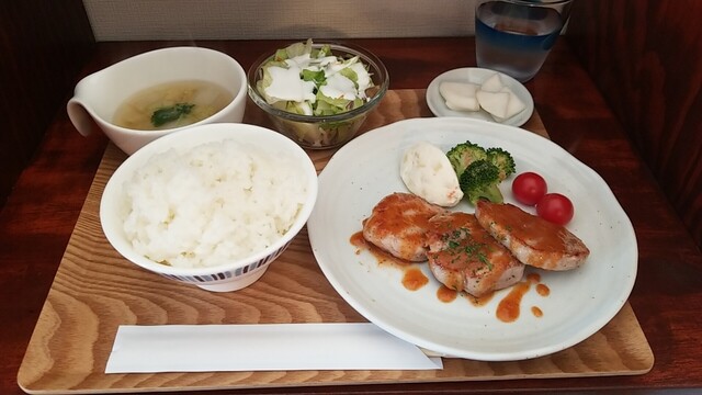 ランチ大盛りとホットコーヒーを注文、今日はスペアリブポシェ ハニーバルサミコソースである。