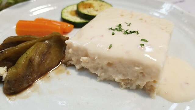 牛肉と里芋もピスタチオのテリーヌ、きざみ茸の和風クリームソース