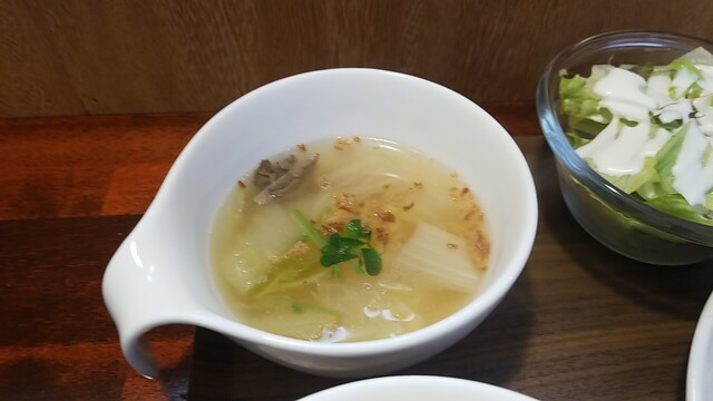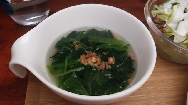 ほうれん草スープ、サラダ、キュウリのお新香、どれもいつも通りに美味い。