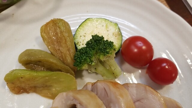 玉子スープ、サラダ、お新香、茄子、ズッキーニ、ブロッコリー、トマト、ソースが余りそう。