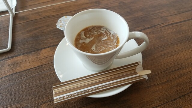 食べ終わり、コーヒーが運ばれる、最近は直ぐにミルクを入れる。