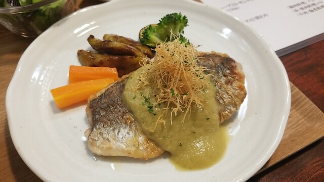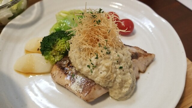 過ぐにランチを注文、イナダポワレ 柚子胡椒香る焼き茄子クリームソースである。