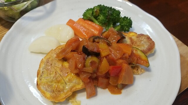 パンプキンのポテサラダ、ブロッコリー、トマト、サラダもいつも通りに美味い。