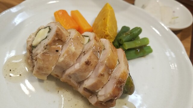 ランチの大盛りとコーヒー、鶏肉とチーズのテリーヌ、マスカルポーネ仕立カポナータ添えである。