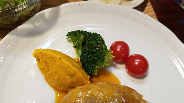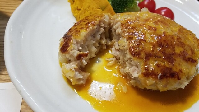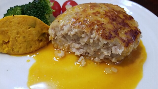 ハンバーグの中からは長芋、オレンジソースは玉子の黄身のようでもある。