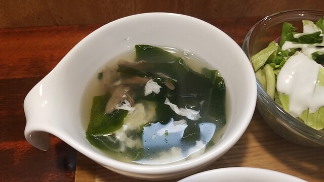 確かに微かにコーヒーの香り?、きのことわかめスープは美味い。